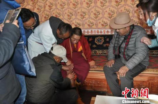 图为医疗专家为当地僧人进行诊治。 西藏自治区藏医院供图