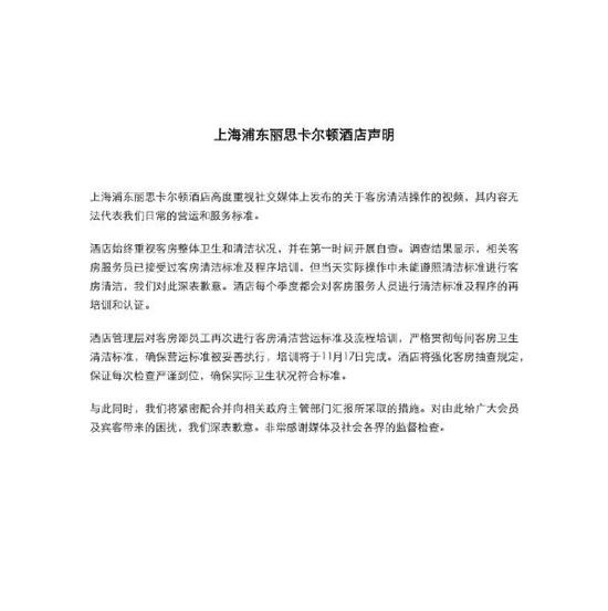 11月15日,针对网络上发布的酒店客房清扫情况视频,上海浦东丽思卡尔顿酒店发表声明。