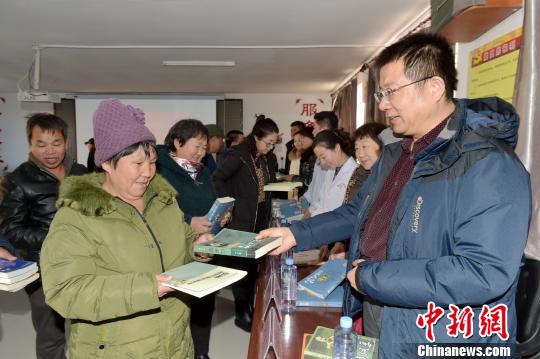图为小分队为广大农猎民赠送书籍。 侯玉鹏 摄