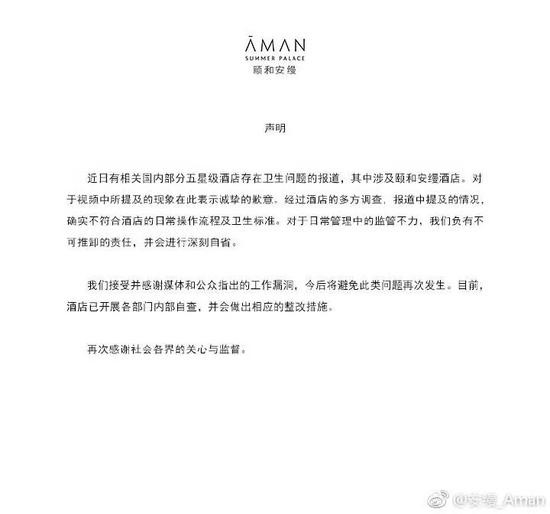 (原标题:北京颐和安缦酒店道歉:监管不力、有不可推卸的责任)