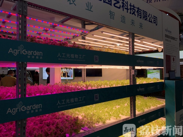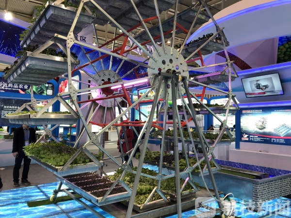 博览会上,一座搭载层层蔬菜的“摩天轮”吸引众人目光。每隔一阵摩天轮转动半圈,最下面一层蔬菜喝饱了营养液后上升到顶部晒太阳,而上层的回到底部补充营养,依次循环,给蔬菜浇水则由滴管自动喷淋“代劳”。