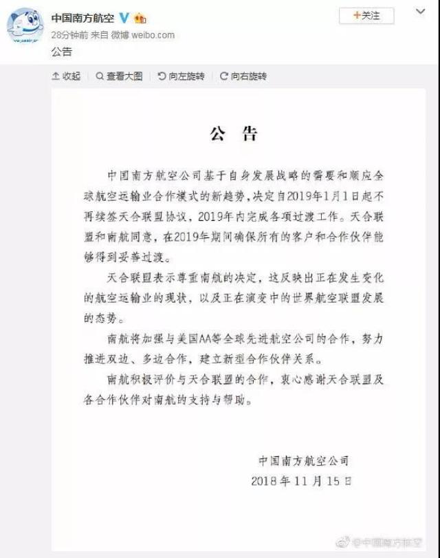 11月15日下午,南方航空发布公告称,基于自身发展战略的需要,为更好地顺应全球航空运输业合作模式新趋势,公司决定自2019年1月1日起不再续签天合联盟成员协议,并在2019年内完成各项过渡工作。