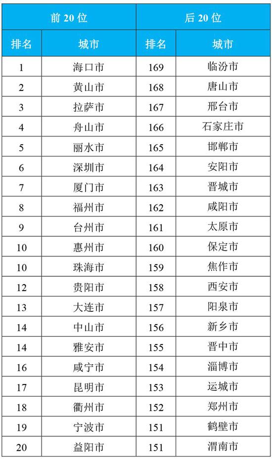 2018年1–10月,169个重点城市中临汾、唐山、邢台市等20个城市空气质量相对较差(从第169名到并列第151名);海口、黄山、拉萨市等20个城市空气质量相对较好(从第1名到第20名,见附表2)。