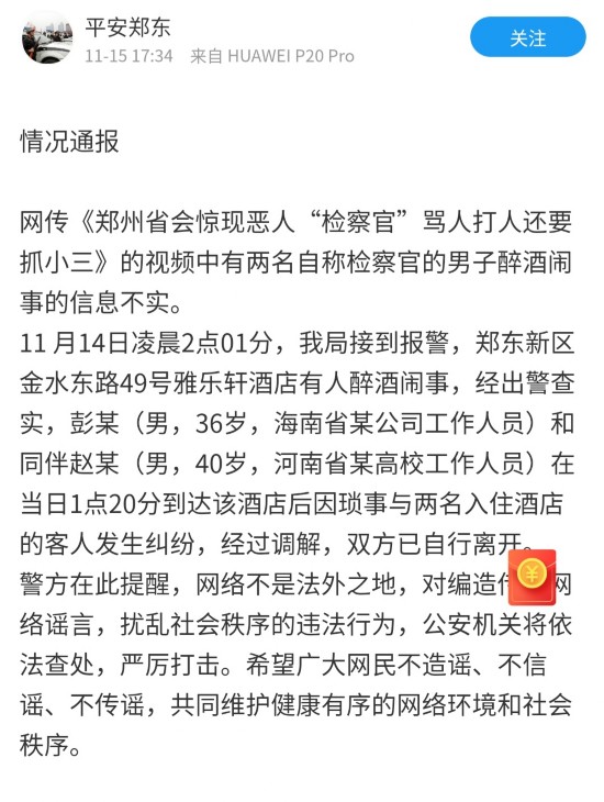 11月14日,网络上传播《省会惊现恶人“检察官”骂人打人还要抓小三》等文章并附短视频,反映有两名声称检察院的检察官当日凌晨2点多在郑州郑东新区49号雅乐轩酒店言行不检等问题。11月15日,河南省检察院对此作出了回应,称网传文章及视频中在酒店吵闹者彭某及另一同行人员并非检察系统工作人员。