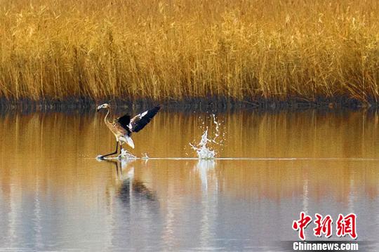 11月12日下午,这片由浅水形成的湿地开始结冰,火烈鸟似乎察觉到了严寒即将来临,它挥动着翅膀向南飞去。(完)
