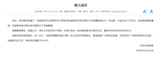 通报称,近日,相关媒体报道了“全椒县农村公路局扶贫干部张伟在省脱贫攻坚巡查中不正确履职被处分”的消息,引起社会广泛关注。全椒县委高度重视,迅速责成县纪委对该问题进行了全面复查。