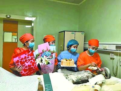 医护人员在病房为晓辉庆生喂蛋糕