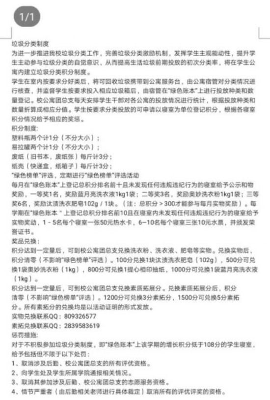 比如两个塑料瓶算1分,1斤废纸算3分,对于未达到积分要求的寝室,将受到取消评优资格等惩罚。