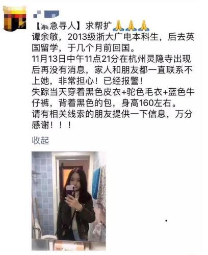 11月15日,大家都在牵挂着失联的23岁姑娘小谭。浙大毕业的她,刚从英国留学回来。11月13日和同学约好吃晚饭,中午后却再也联系不上。