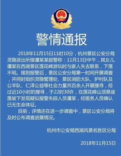 谭妈妈告诉记者,最先发现女儿失联的是她的同学,“13日下午,我女儿约了同学一起吃饭。当时她和同学说在灵隐景区,玩好了再去见面吃饭。但是之后女儿同学就联系不上她了。他们也没有我的电话,还特意去学校找到了我老公的电话,这才联系上了我们。”