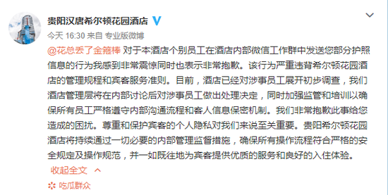 新京报快讯 据贵阳汉唐希尔顿花园酒店官方微博消息 对于本酒店个别员工在酒店内部微信工作群中发送您部分护照信息的行为我感到非常震惊同时也表示非常抱歉。该行为严重违背希尔顿花园酒店的管理规程和宾客服务准则。目前,酒店已经对涉事员工展开初步调查,我们酒店管理层将在内部讨论后对涉事员工做出处理决定,同时加强监管和培训以确保所有员工严格遵守内部沟通流程和客人信息保密机制。我们非常抱歉此事给您造成的困扰。尊重和保护宾客的个人隐私对我们来说至关重要。贵阳希尔顿花园酒店将持续通过一切必要的内部管理监督措施,确保所有操作流程符合严格的安全规定及操作规范,并一如既往地为宾客提供优质的服务和良好的入住体验。