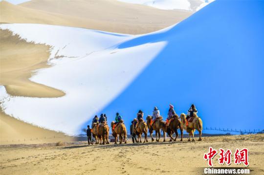 图为11月15日,游客在雪后的甘肃敦煌鸣沙山月牙泉景区欣赏大漠雪景。 王斌银 摄