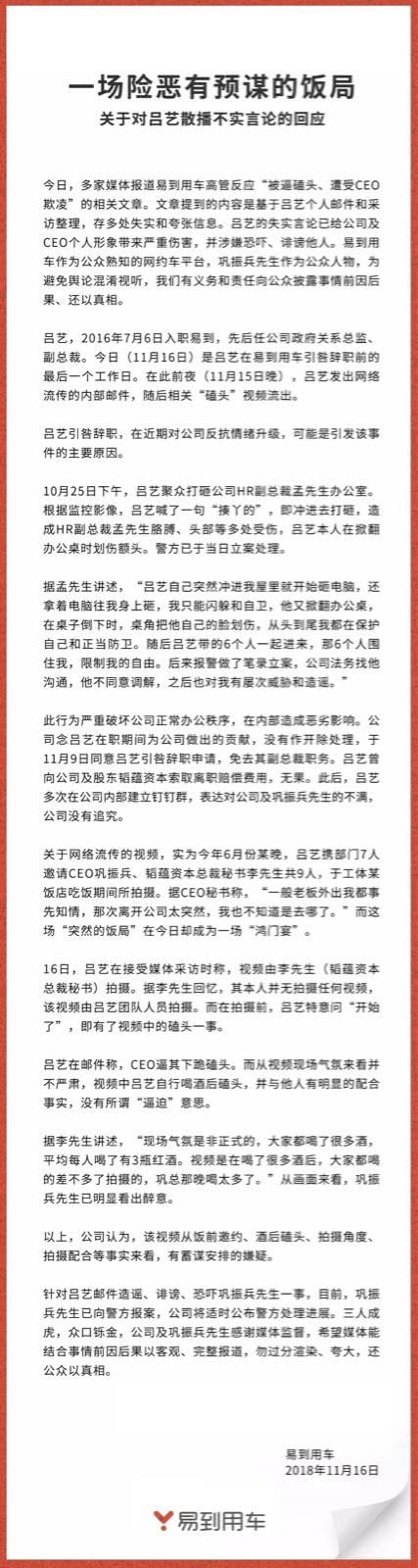 11月16日晚间,网约车平台易到对当日上午媒体报道的易到用车高管反应‘被逼磕头、遭受CEO欺凌’”事件进行回应,称这些内容是基于吕艺个人邮件和采访整理,存多处失实和夸张信息。