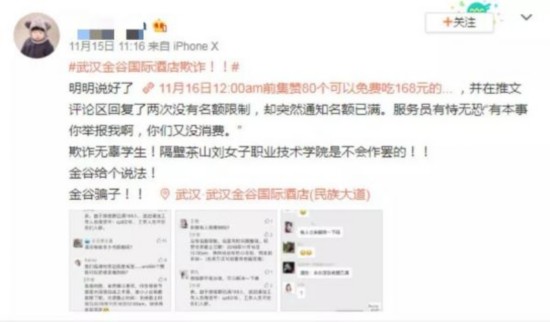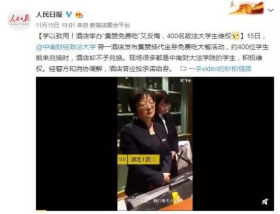 11月15日,@中南财经政法大学 旁一酒店发布集赞换代金券免费吃大餐活动,约400位学生前来兑换时,酒店却不予兑换。现场很多都是中南财经政法大学法学院的学生,积极维权。经警方和消协调解,酒店答应按承诺给券。