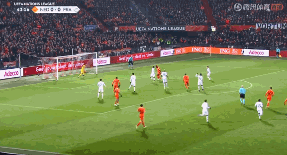 第44分钟,弗兰基-德容左路传中,恩宗齐头球解围出现致命失误,巴贝尔的射门被洛里斯奋力挡出,维纳尔杜姆中路补射命中左下角,荷兰1比0领先法国。