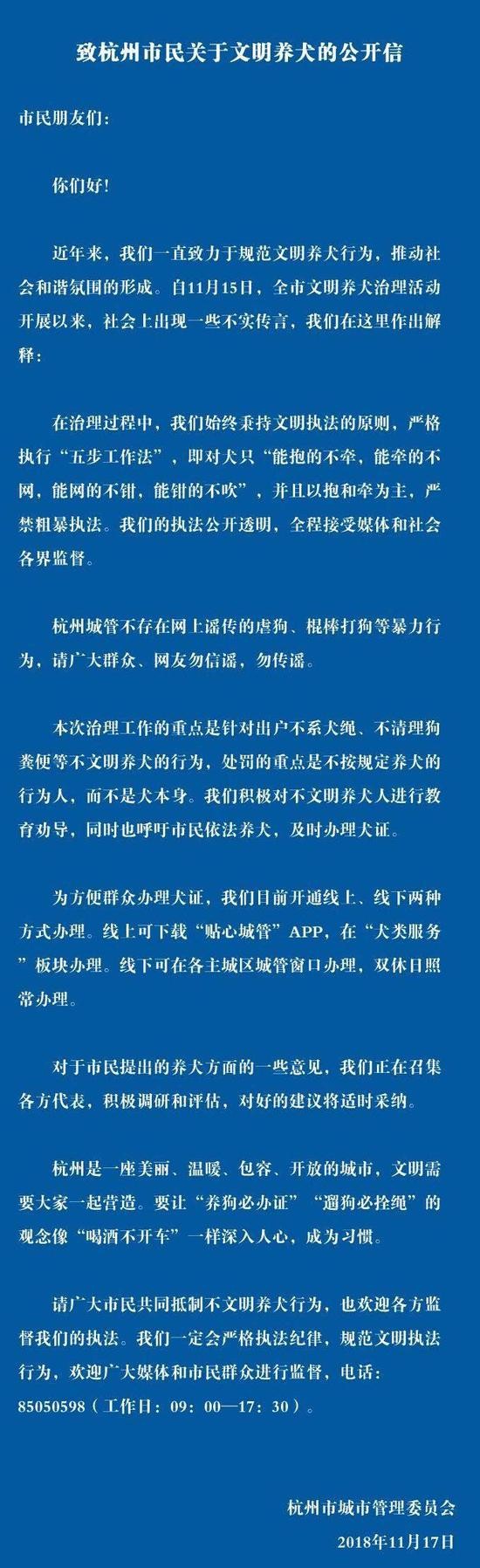 杭州市城管表示,“在此次治理过程中,没有发生一起暴力执法事件,没有一条狗发生非正常死亡。近期网上出现的伤狗行为,均非杭州城管执法所为。”