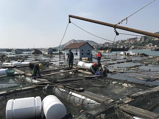 11月14日,渔民们正在修复受损的渔排。
