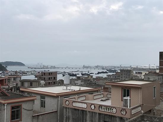 人多地少的肖厝村,可见远处的渔排和化工厂。