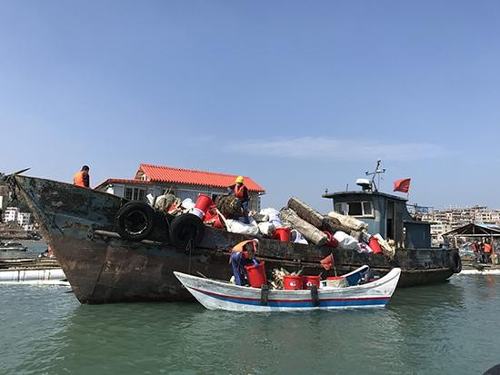 11月14日,应急抢险人员在肖厝村渔排附近转移被腐蚀的泡沫。