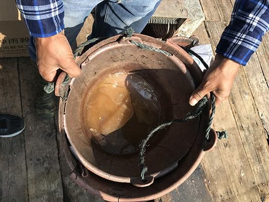 11月14日,肖厝村渔排上的渔民向记者展示水桶内残留的碳九油污。