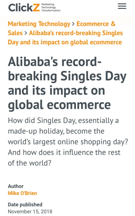 图/ClickZ称,天猫双11对全球电商市场产生了巨大而深远的影响
