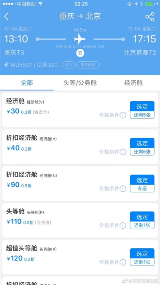 11月17日消息,东方航空App今天凌晨突然出现Bug,多条国内航线头等舱商务舱往返机票,最低只需90元!广州到上海头等舱120,经济舱50,北京广州经济舱60,广州北京公务舱200等等。有网友甚至买了60多张机票,也有网友临时起意,来了一场说走就走的旅行。