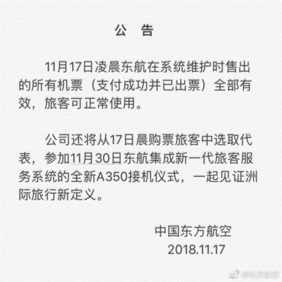 对此,东方航空官方微博发布公告,表示11月17日凌晨东航在系统维护时售出的所有机票(支付成功并已出票)全部有效,旅客可正常使用。