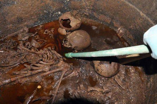 专家初步认为,这副石棺的年代应是距今2千年前,这3具人骨皆为男性,生前可能都是士兵,其中1人的头骨有中箭的痕迹。