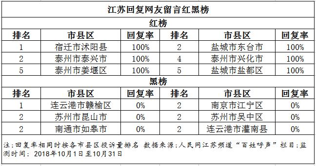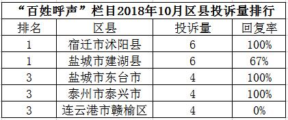 区县方面,投诉量排名第一的是宿迁市沭阳县、盐城市建湖县,10月均有6条投诉,其中沭阳县回复率达100%。此外,泰州市泰兴市、泰州市姜堰区、泰州市兴化市、盐城市盐都区、盐城市东台市、淮安市盱眙县、淮安市洪泽区回复率均达100%。