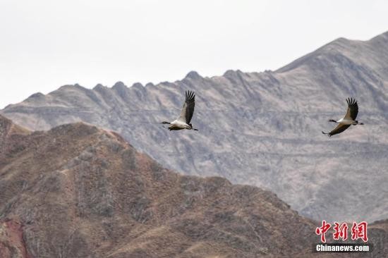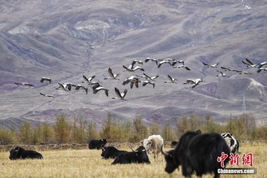 11月16日,黑颈鹤飞抵拉萨河谷越冬。黑颈鹤是高原特有鹤类,国家一级重点保护野生动物。中新社记者 何蓬磊 摄