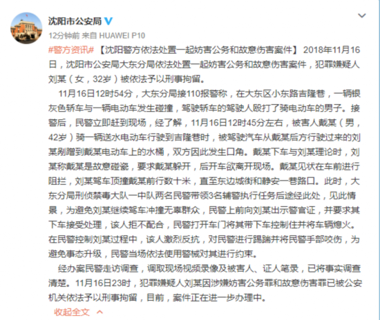 新京报快讯 据沈阳市公安局消息,2018年11月16日,沈阳市公安局大东分局依法处置一起妨害公务和故意伤害案件,犯罪嫌疑人刘某(女,32岁)被依法予以刑事拘留。