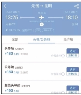 17日凌晨,部分网友发布消息称,东方航空官方APP、网站疑似出现故障,大量往返机票价格不到全价票价格的10%。在网友发布的APP截图中可以看到,12月8日无锡飞往昆明的头等舱售价180元,12月9日昆明飞往无锡的头等舱仅售170元,往返机票折扣都为0.4折。也就是说,只需要不到400元的机票,就可以乘坐东方航空的头等舱,往返昆明和无锡。到17日下午,同样行程的头等舱往返机票售价已达3400元。