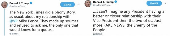 特朗普说:“《纽约时报》像往常一样,报道了一则关于我和副总统之间关系的假新闻。他们编造了消息来源。我想不到任何一位总统和副总统间的关系会比我和彭斯的更密切。这只是更多的假新闻,人民的敌人!”