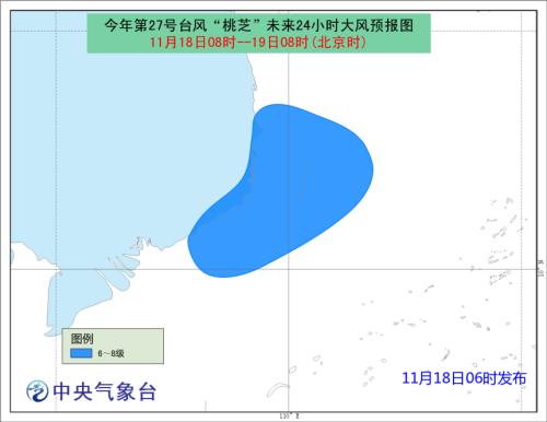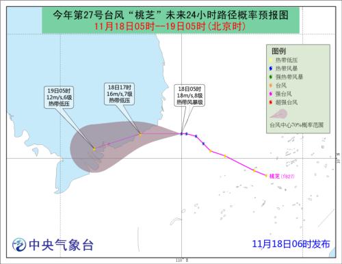 中新网11月18日电 据中央气象台网站消息,18日06时中央气象台发布台风蓝色预警,今年第27号台风“桃芝”生成,今晨5点“桃芝”中心位于越南胡志明市偏东约365公里的南海西南部海面上,预计将于今天傍晚前后在上述沿海登陆,以后强度将明显减弱。