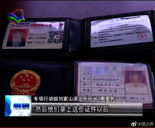 李秋田表示:“经过初步审查以后,他的这个身份是中共中央政研室工作站驻山西工作站,他这个身份是假的,而且这个证件也是自己来做的。他相跟的一个同伙刘某,身份是山西一家新闻网站农村频道的记者,他的这个记者证,他的这个身份也是假的。通过后期调查他的身份,他就不在那上班,单位就没有这个人。”
