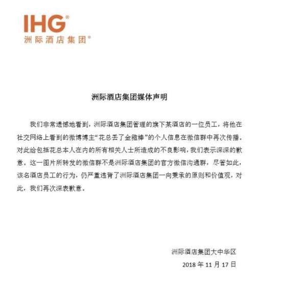 “我们非常遗憾地看到,洲际酒店集团管理的旗下某酒店的一位员工,将他在社交网络上看到的微博博主“花总丢了金箍棒”的个人信息在微信群中再次传播。对此给包括花总本人在内的所有相关人士所造成的不良影响,我们表示深深的歉意。这一图片所转发的微信群不是洲际酒店集团的官方微信沟通群,尽管如此,该名酒店员工的行为,仍严重违背了洲际酒店集团一向秉承的原则和价值观,对此,我们再次深表歉意。”