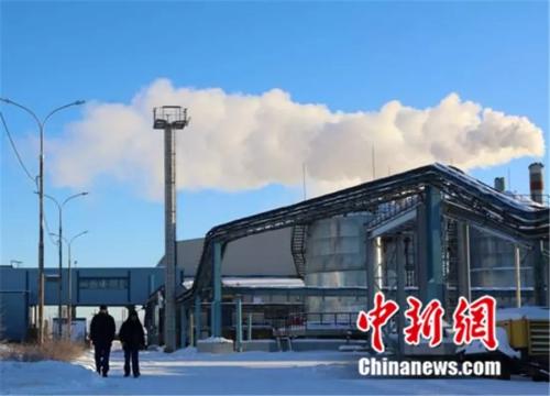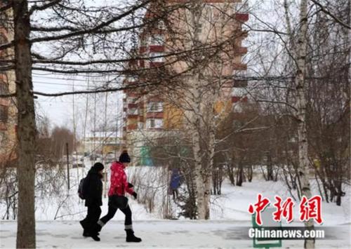 近日,两名行人走过米尔内小区。11月米尔内已经白雪皑皑,气温达到零下30摄氏度左右。