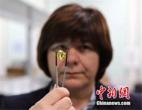 工作人员展示一颗不久前从米尔内寄来的黄钻。