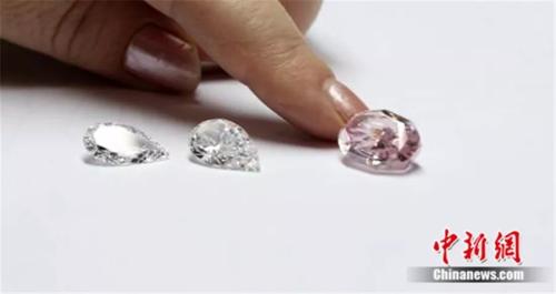 工作人员展示被初步切割、打磨的钻石。图中一对透明钻石各重约6克拉,总价值在65万美元以上。罕见的紫色钻石重约15克拉,价格难以估量。