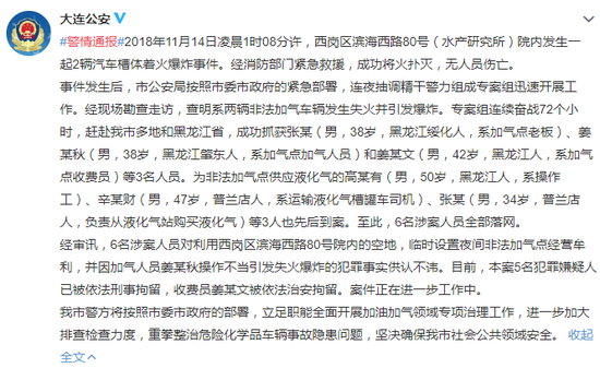 (原标题:大连爆炸液化气罐车系非法加气 6名涉案人员已落网)