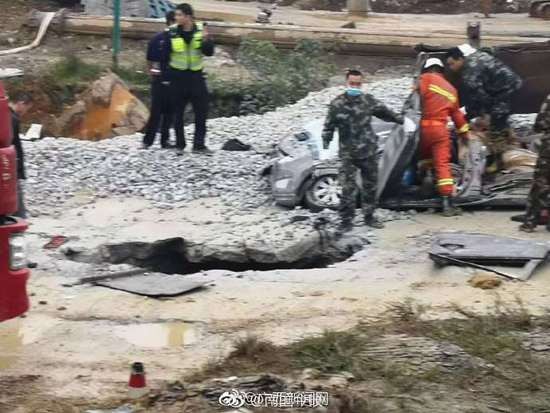 记者注意到,事故地点的道路中间,可以看到一个直径两米左右的大坑。据现场的一些村民介绍,重卡是一侧轮子压塌路面陷入坑里导致侧翻的。