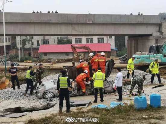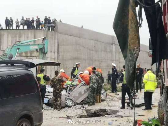 当天下午,记者接到报料赶到事发现场时,侧翻的重型卡车已被移开、摆正,救援人员清走了覆盖在面包车上的碎石,动用专业的破拆工具,试图从已经变成“铁饼”的面包车中营救被困人员。