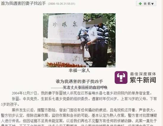 2006年10月26日晚,张某某发出一条名为《谁为我遇害的妻子找凶手》的微博,希望能早日找到凶手。