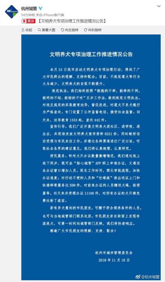 中新网11月18日电 杭州市城市管理委员会官方微博18日发布《文明养犬专项治理工作推进情况公告》。公告称,本月15日杭州启动文明养犬专项治理行动,得到了广大市民群众的理解、支持和配合。目前,不规范溜犬等行为大为减少,文明养犬的自觉不断提升。