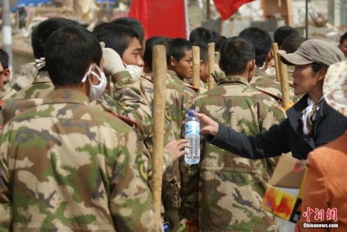 群众为救灾战士递上矿泉水。武警玉树支队 李大龙 供图