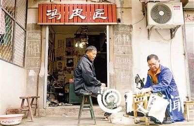 上完课,回他的皮匠铺子,一路上他都在追问,我们百度的答案他都不满意。皮匠铺在北碚城的边上,从大学出来,坐公交要40分钟,当地人喊308农贸市场。周边人口不多,市场有点冷清,皮匠铺在市场背后,居民楼朝街的客厅改的,五六平方米,月租400元,老冯在这里补了7年皮鞋。