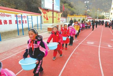 “我们这里最高峰时,安置了177人。”王胜年轻的脸被冬天的风吹得红彤彤,“学生娃娃些二十几个,现在都安置到县上去继续读书了。一部分村民房子没问题的,也回家了,还在这里的人大概100出头。”他说话的当口,白玉县人民医院的医生撩开一个帐篷走了出来,2人抬着一锅预防感冒的中药,招呼着村民们来喝。