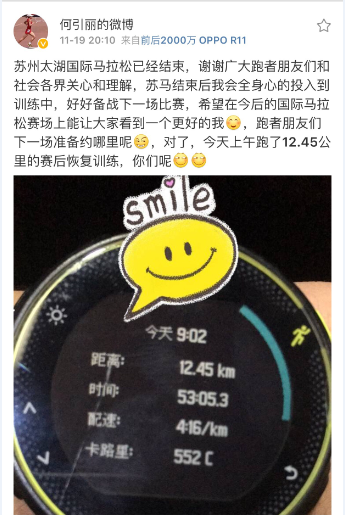 今晚8时10分,何引丽发了这样一条微博,“苏州太湖国际马拉松已经结束,谢谢广大跑者朋友们和社会各界关心和理解,苏马结束后我会全身心投入到训练中,好好备战下一场比赛,希望在今后的国际马拉松赛场上能上大家看到一个更好的我,跑者朋友们下一场准备约哪里呢?对了,(我)今天上午跑了12.45公里的赛后恢复训练,你们呢?”