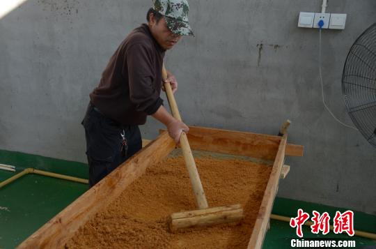 从糖汁下锅到转移至最后一口锅里,沸腾的糖浆不断翻滚了20多分钟,待到颜色合适,糖稀出锅的时机也就到了,一旁的师傅傅明帅利索地将糖稀转移到木质糖槽内,并不断搅拌,逐渐冷却的糖稀慢慢成型。傅明帅介绍,这个步骤叫“打沙”,通过搅拌,让空气进入糖里,打出来的糖形似沙子,不粘口,糖的品质很大程度上取决于打沙师傅的手艺。