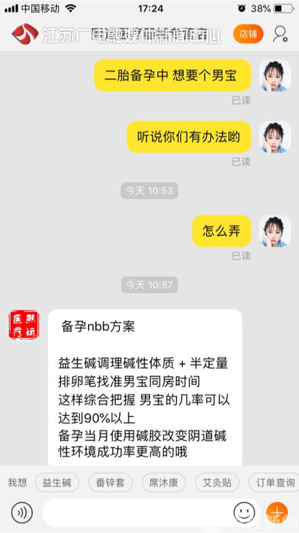 记者调查发现,某电商平台,部分卖家售卖的"碱胶"、"碱性护理液"、"碱性含片"等产品,大多顶着"干预生育"的光环,甚至鼓吹"能让怀男孩的概率超过90%"。